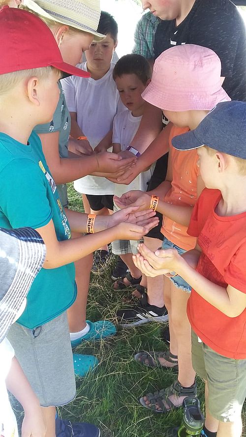 Nach dem Frühstück wurden die Kinder und Jugendlichen in Gruppen eingeteilt, welche schon bei der Anmeldung am Freitag ausgelost wurden. Hier entstanden aus den verschiedenen Vereinen Teams, die an 25 Stationen kreative und auch sportliche Aufgaben zu lösen hatten. Es mussten mindestens 10 Aufgaben absolviert werden, die sich die Gruppe selbst auswählen konnten.Dabei war Teamfähigkeit gefragt, Ideen mussten umgesetzt werden und ein gutes Miteinander war eine Grundvoraussetzung. Ob beim kreativen Naturbild legen, Gummistiefel-Weitwurf, Torwandschiessen, Dosenwerfen, …zeigte sich – jeder hat Stärken und auch Schwächen.